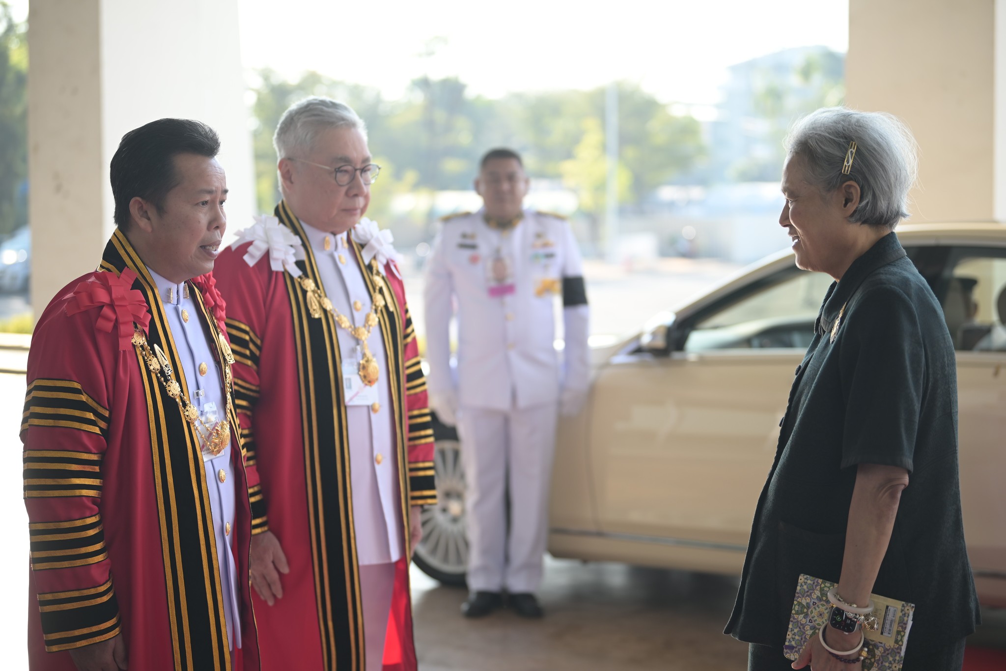 ในการนี้ ศาสตราจารย์พิเศษ ดร.กิตติพงษ์ กิตยารักษ์ นายกสภาสถาบัน และ รองศาสตราจารย์ ดร.คมสัน มาลีสี อธิการบดี พร้อมด้วยคณะผู้บริหาร บุคลากร และนักศึกษา เฝ้าฯ รับเสด็จ โดยอธิการบดีได้กราบบังคมทูลรายงานกิจการของสถาบัน และกราบบังคมทูลเบิกผู้ทรงคุณวุฒิเข้ารับพระราชทานปริญญากิตติมศักดิ์