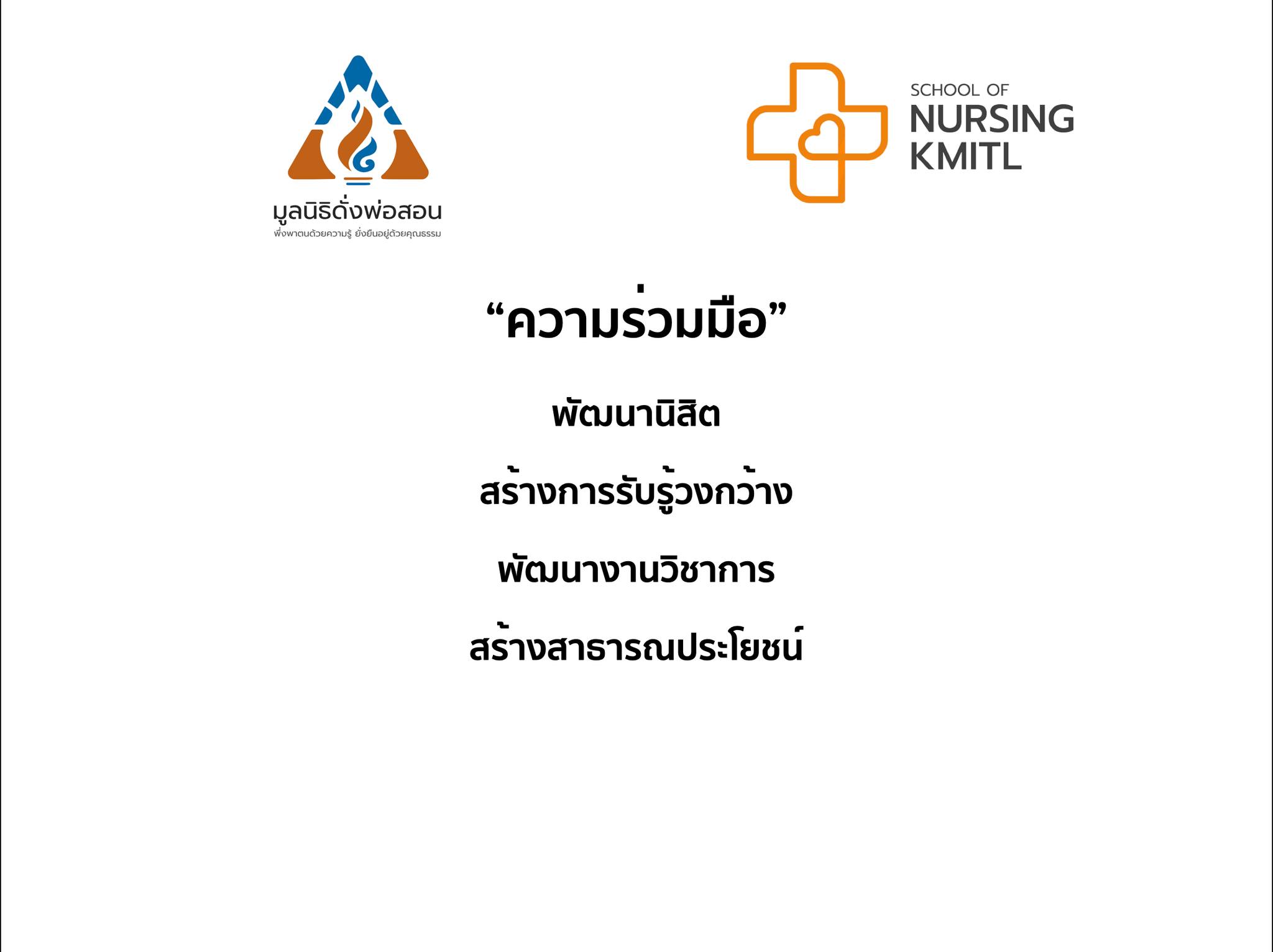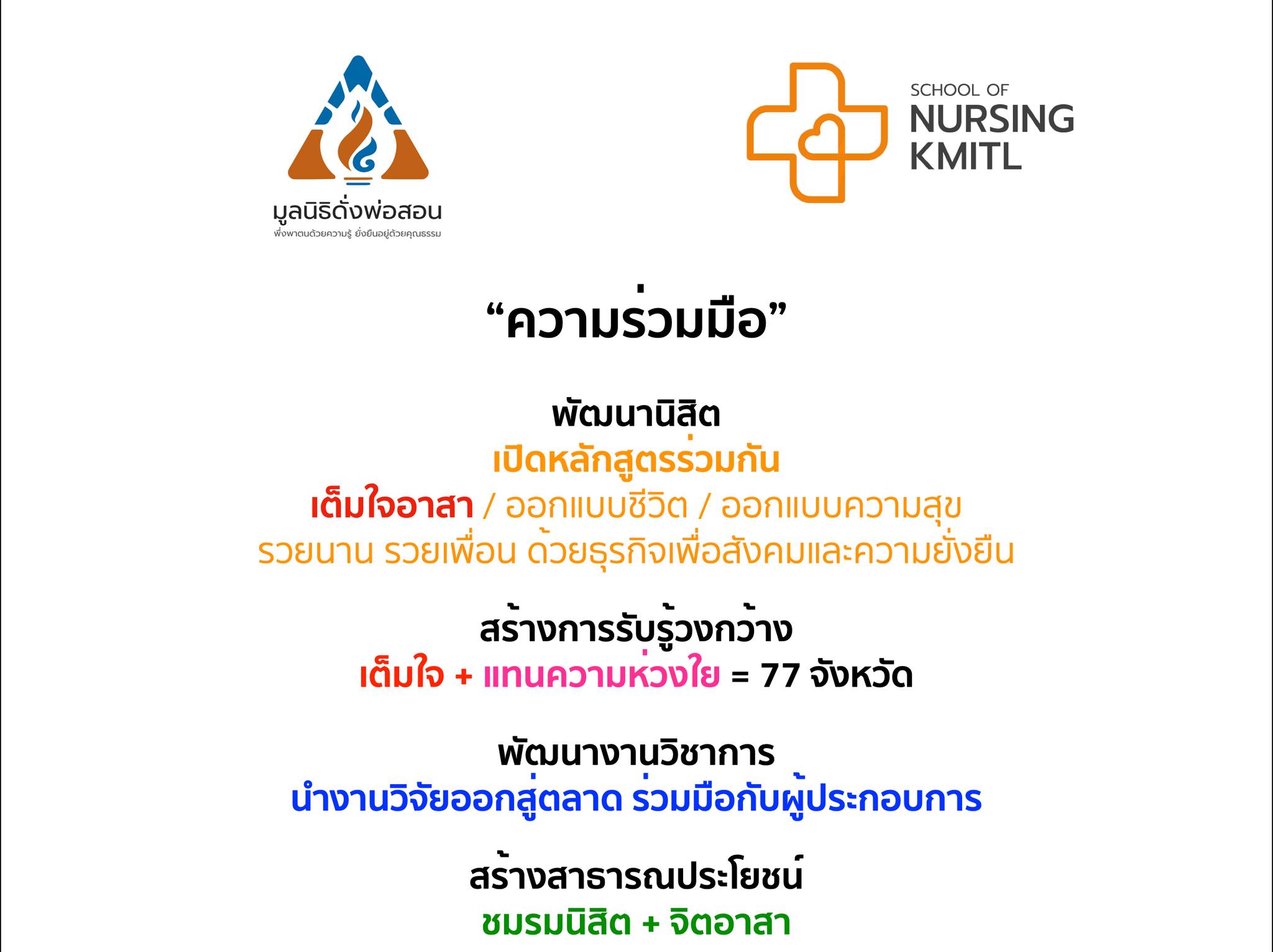 คณะพยาบาลศาสตร์ สจล. นำโดย ผศ.ดร.บุหงา ตโนภาส รักษาการแทนคณบดี ให้การต้อนรับ นายณัฐวรรธน์ ภรนรา ผู้อำนวยการและประธานมูลนิธิดั่งพ่อสอน พร้อมคณะผู้บริหาร ผู้ประกอบการจิตอาสา โครงการ “เต็มใจ”