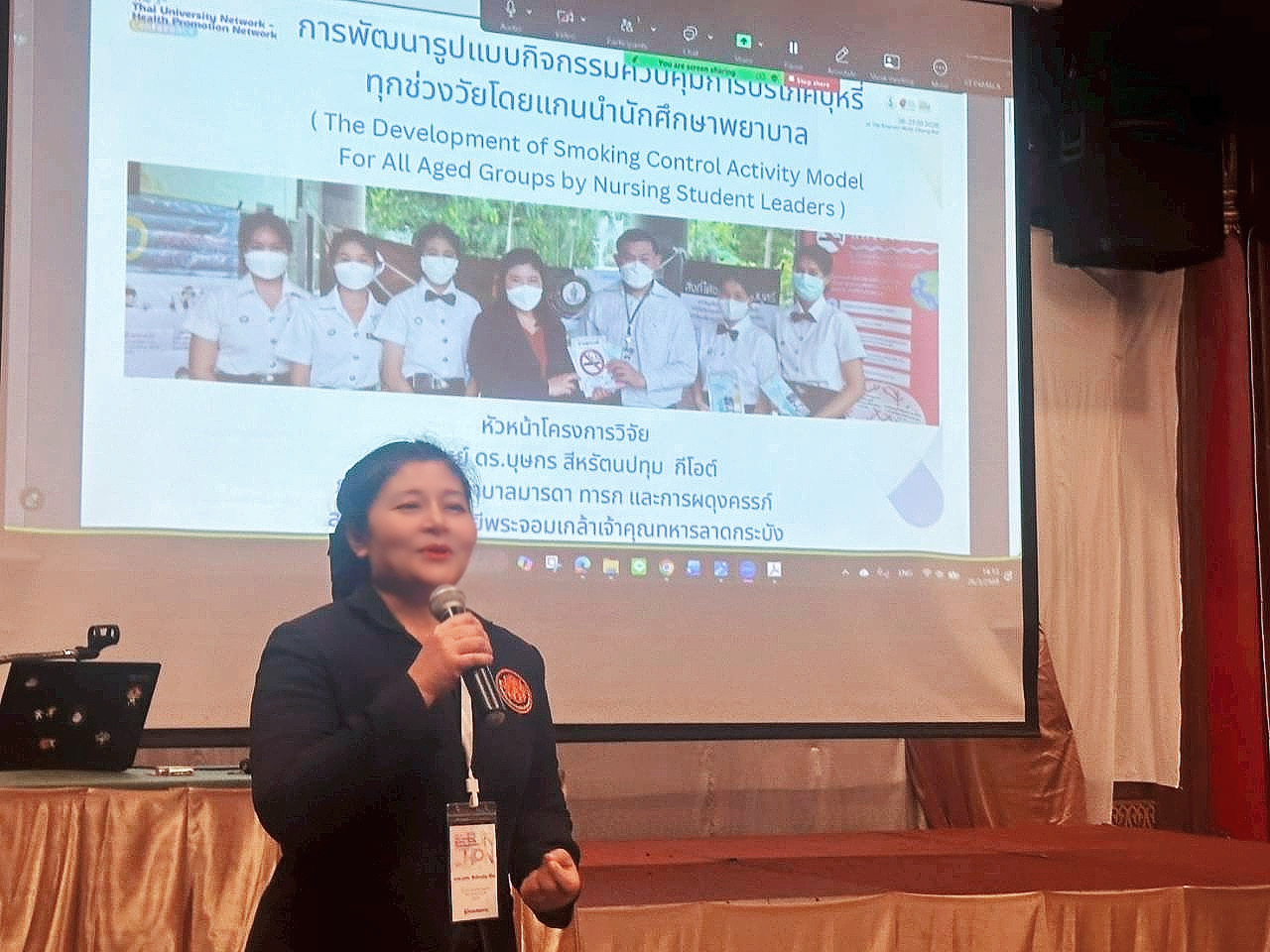 โดยได้นำเสนอผลงานวิจัยและร่วมเป็นวิทยากรในฐานนวัตกรรม มุ่งเน้นประเด็นสำคัญเกี่ยวกับ “มหาวิทยาลัยปลอดควัน ปลอดบุหรี่และบุหรี่ไฟฟ้า ปลอดตีตรา”