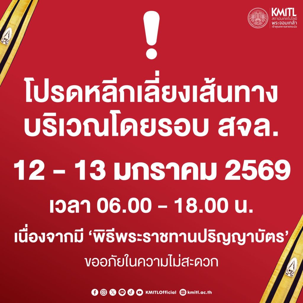 ข่าวประชาสัมพันธ์ประกาศ!!! โปรดหลีกเลี่ยงเส้นทางบริเวณโดยรอบ สจล. วันที่ 12 – 13 มกราคม 2569 ข่าวประชาสัมพันธ์ / By natsima ประกาศ #สถาบันเทคโนโ